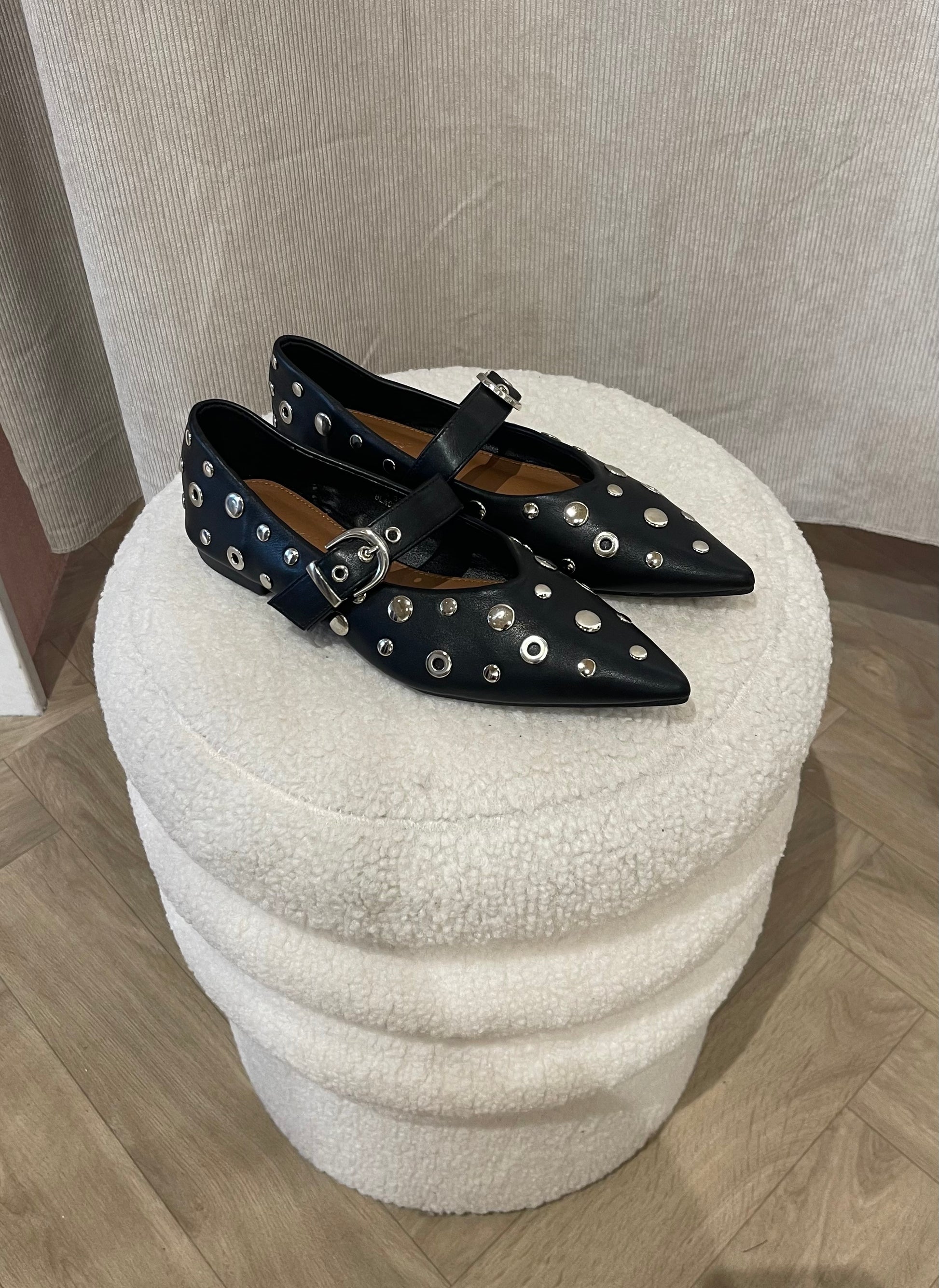 Hoe leuk is deze ballerina met zilveren studs. Met deze schoenen maak je je outfit helemaal af. De ballerina is zwart met zilveren details.
