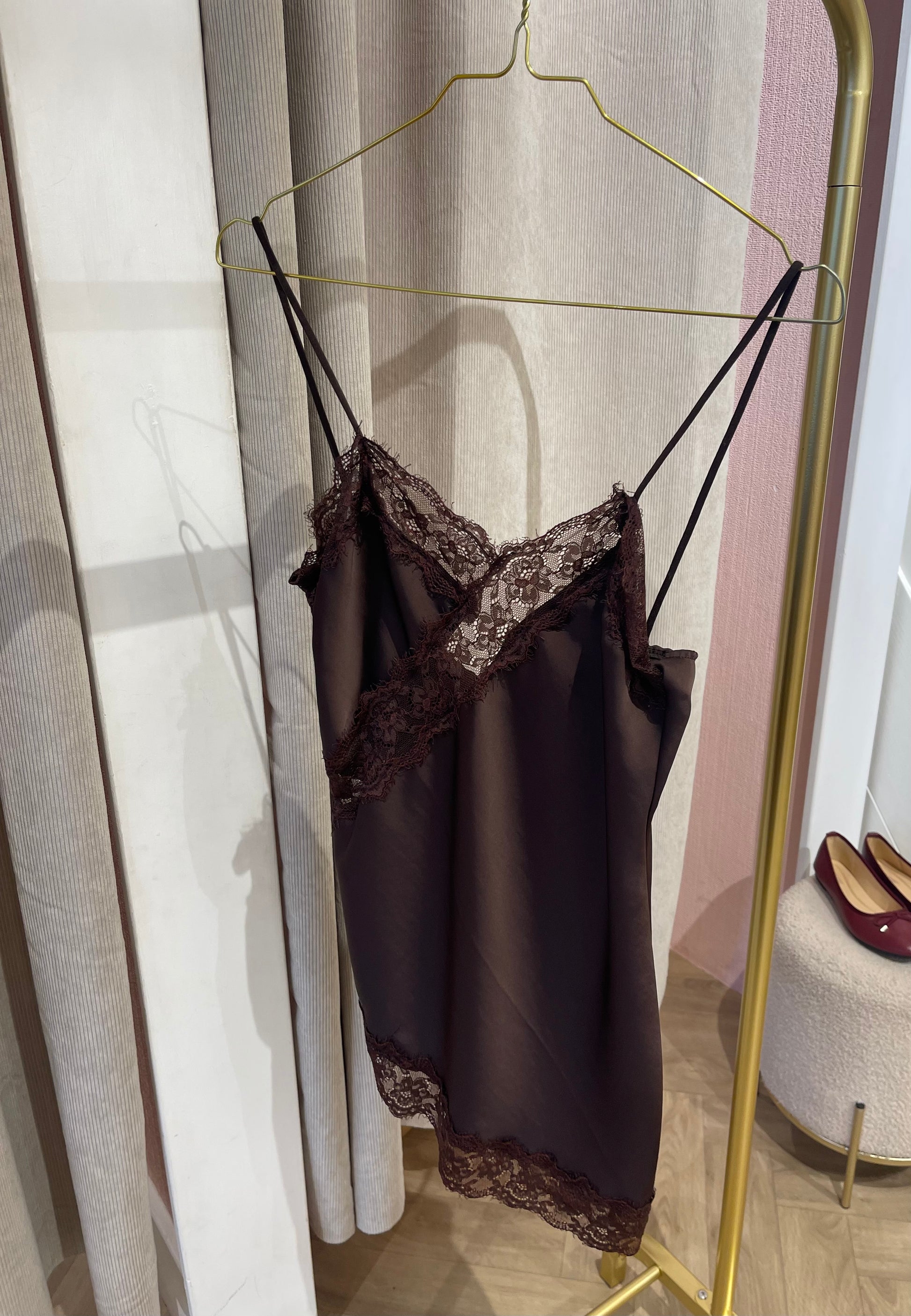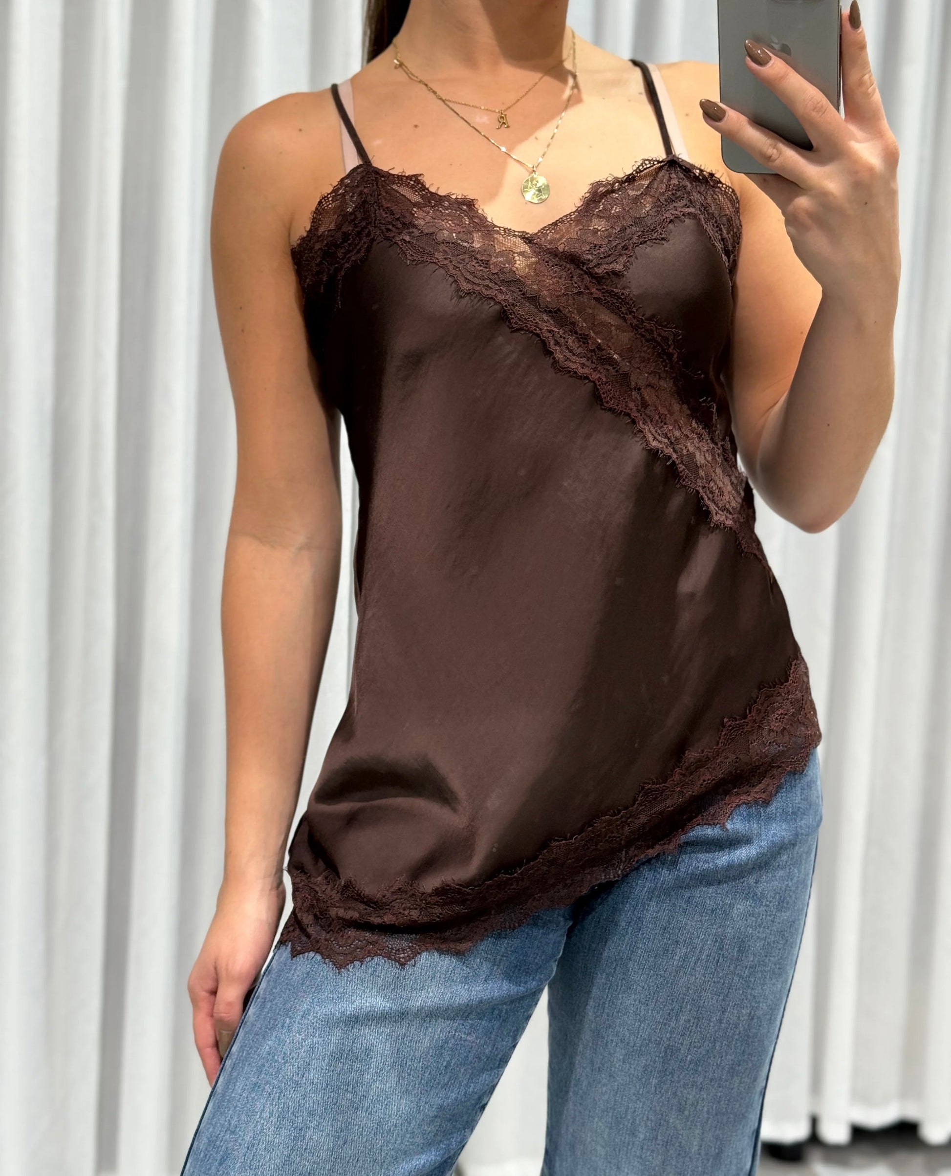 De trend van dit moment! Leuke satijnen top met kanten details. Leuk om onder een trui te dragen. Prachtige bruine kleur, perfect om jouw outfit mee af te stylen!
